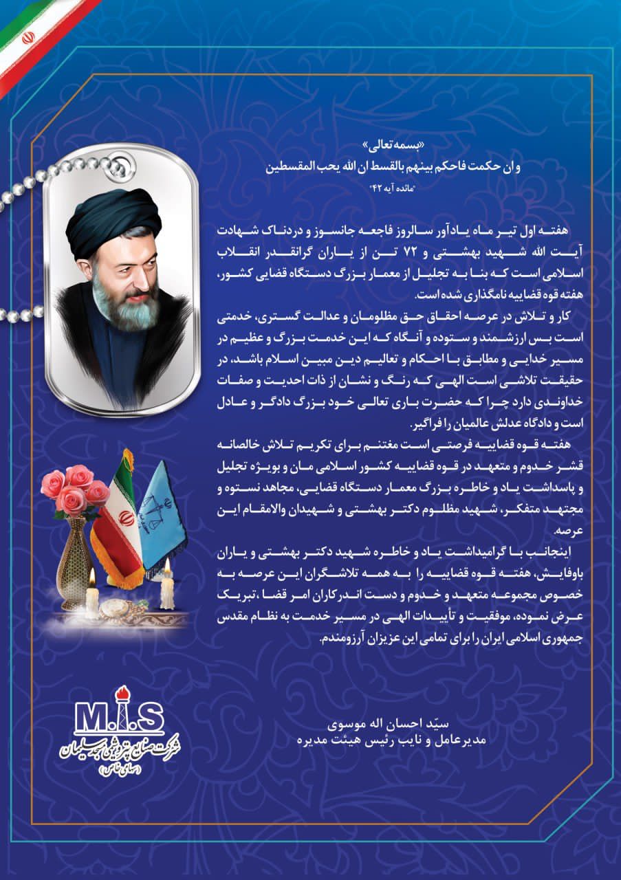 هفته قوه قضائیه فرصتی است مغتنم برای تکریم تلاش خالصانه قشر خدوم و متعهد در قوه قضاییه کشور اسلامی‌مان و بویژه تجلیل و پاسداشت یاد و خاطره بزرگ معمار دستگاه قضایی، مجاهد نستوه و مجتهد متفکر، شهید مظلوم دکتر بهشتی و شهیدان والامقام این عرصه.
