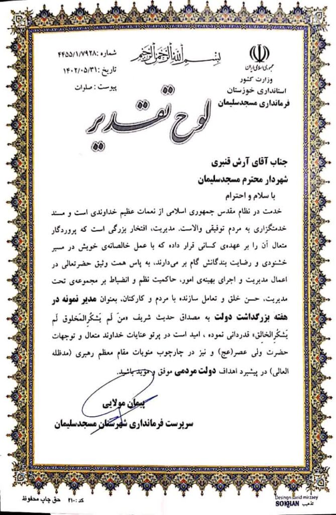 لوح تقدیر فرماندار به آرش قنبری بعنوان مدیر نمونه شهرستان مسجدسلیمان