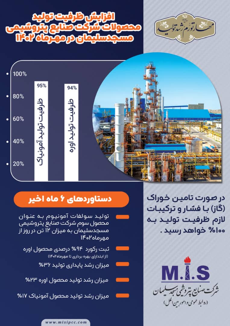 افزایش ظرفیت تولید محصولات شرکت صنایع پتروشیمی مسجدسلیمان در مهرماه ۱۴۰۲ و ثبت رکورد ۹۴ درصدی محصول اوره