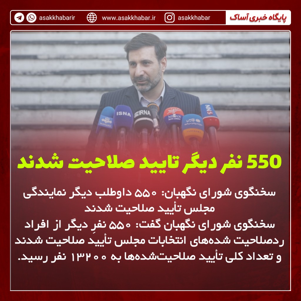 سخنگوی شورای نگهبان گفت: ۵۵۰ نفرِ دیگر از افراد ردصلاحیت شدههای انتخابات مجلس تأیید صلاحیت شدند و تعداد کلی تأیید صلاحیتشدهها به ۱۳۲۰۰ نفر رسید.