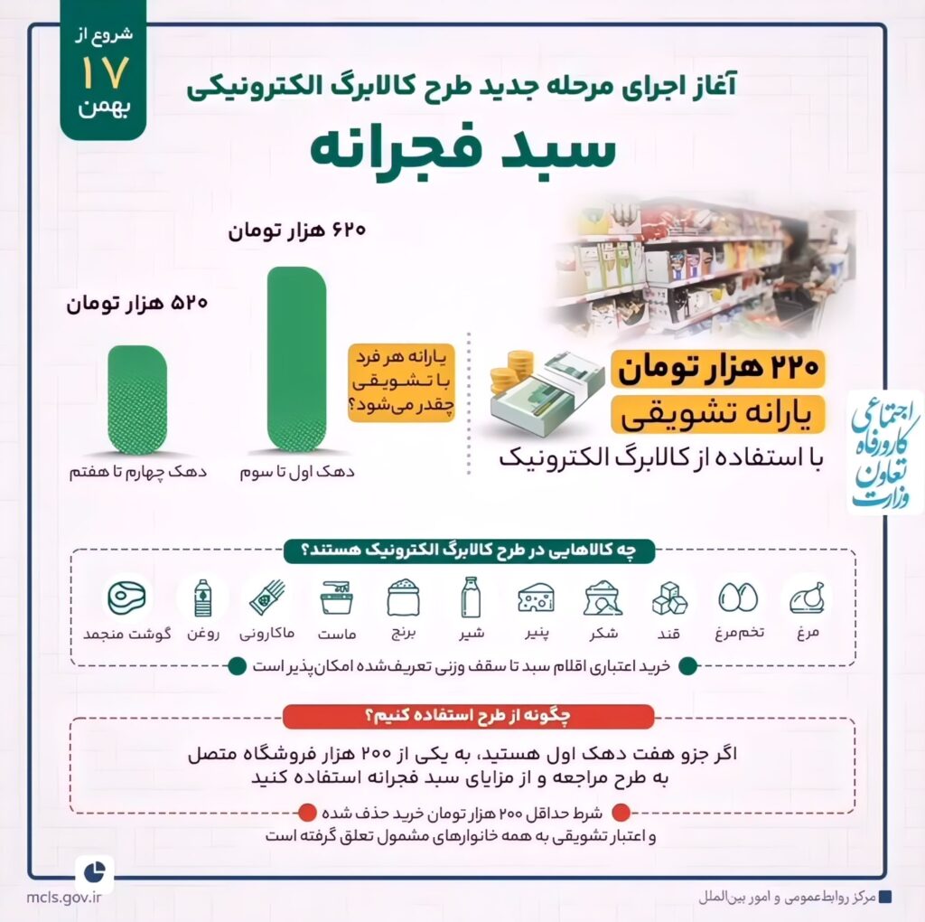 به گزارش آساک خبر در راستای حمایت مضاعف از سبد غذایی خانوار یارانهبگیر با اولویت خانوار دهکهای پایین جامعه از ۱۷ بهمنماه آغاز و تا ۱۷ اردیبهشتماه سال آینده ادامه خواهد داشت.